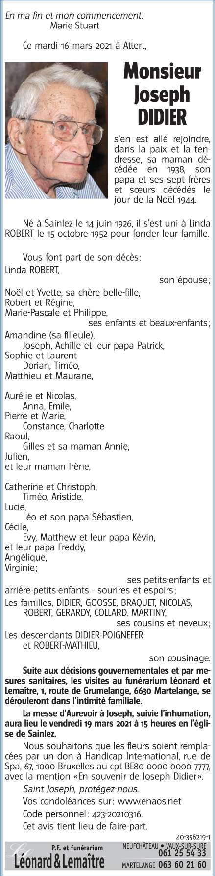 Décédé à Attert (6717) le mardi 16 mars 2021 à l'âge de 94 ans
