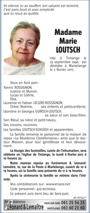 Décédée à Martelange (6630) le jeudi 2 février 2017 à l'âge de 70 ans