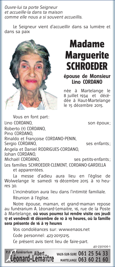 Décédée à Martelange (6630) le mardi 15 décembre 2015 à l'âge de 81 ans
