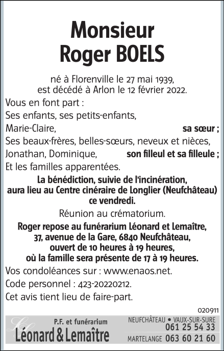 Décédé à Arlon (6700) le samedi 12 février 2022 à l'âge de 82 ans