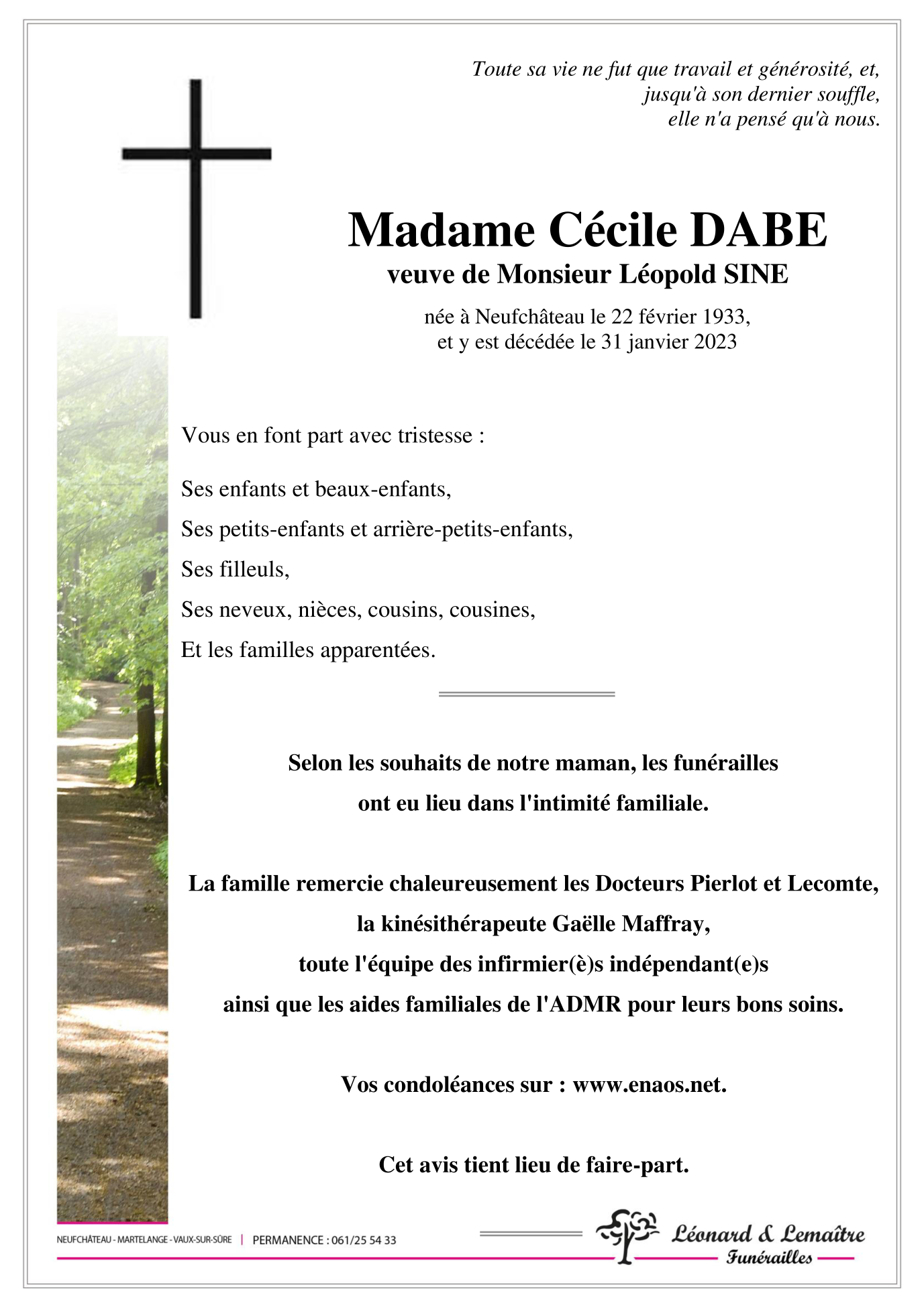 Veuve de Monsieur Léopold SINE