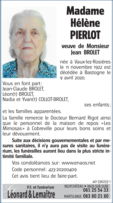 Décédée à Bastogne (6600) le jeudi 9 avril 2020 à l'âge de 97 ans