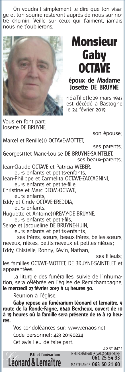 Décédé à Bastogne (6600) le dimanche 24 février 2019 à l'âge de 71 ans